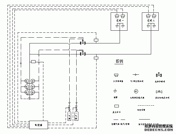 七氟丙烷自動滅火裝置原理圖參見下圖。根據(jù)規(guī)范要求及用戶的具體情況可以采用全淹沒的單元獨立系統(tǒng)和組合分配系統(tǒng)兩種組成方式。所謂單元獨立系統(tǒng)是指由一 套滅火劑儲存裝置對應(yīng)一套管網(wǎng)系統(tǒng),保護一個防護區(qū)域的構(gòu)成形式。所謂組合分配系統(tǒng)是指由一套公共的滅火劑儲存裝置對應(yīng)幾套管網(wǎng)系統(tǒng),保護兩個或兩個以上 防護區(qū)域的構(gòu)成形式。